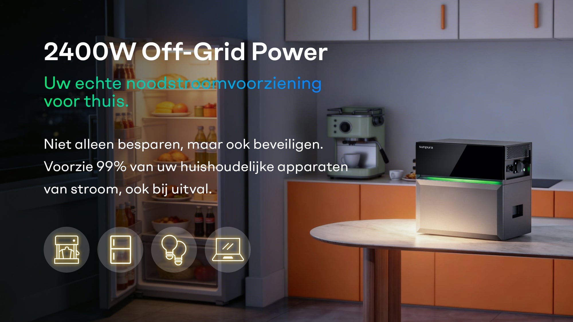 Jouw eigen noodstroomvoorziening voor thuis. Blijf je koffiezetapparaat, koelkast en verlichting gebruiken – ook als het net uitvalt. Niet alleen besparen, maar ook zekerheid creëren.