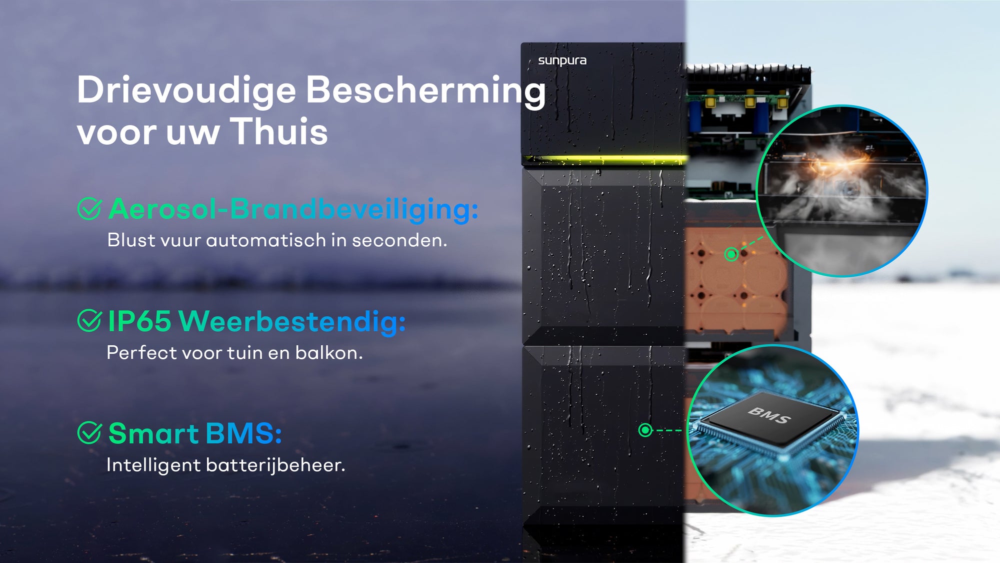 Maximale veiligheid dankzij geavanceerde technologie. Of het nu gaat om extreme kou, zware regen of interne oververhitting – ons drievoudige beveiligingssysteem reageert voordat er iets gebeurt.